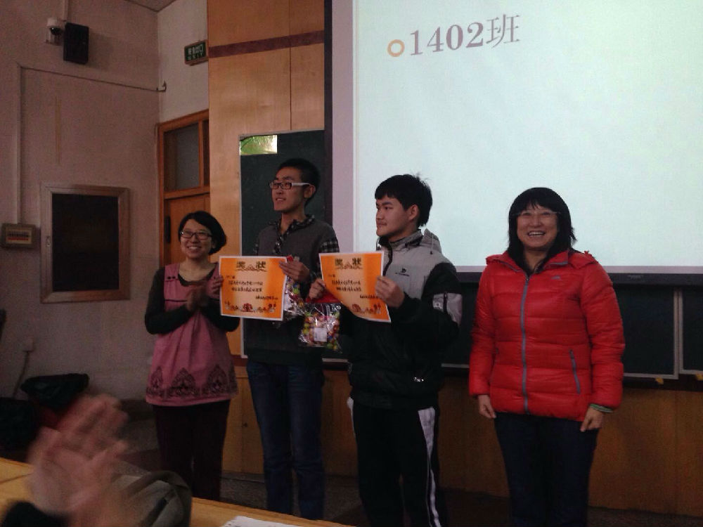 在总结表彰环节,首先由辅导员老师们颁发了2014级班级凝聚力建设优胜奖。在本学期的“班级凝聚力建设方案设计大赛”中,1407班和1402班的设计方案在年级评比中脱颖而出,代表ag亚游官网