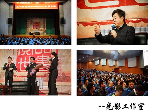 讲座开始前,主办方播放了节目组精心录制的法大学子心目中的朱军MV。简短的一段视频表现出法大学子对朱军到来的期待和欢迎。紧接着,朱军开始讲述属于他的艺术人生:从初中以前没有讲过普通话,到现在的央视金话筒,他苦心历练;从一个侦察兵到著名的主持人,他不断在舍中求得;从站在镁光灯聚焦的地方,到站在书桌前静心描摹画作,他洗尽铅华。