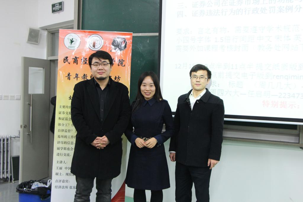 ag亚游官网承办的学术辅导专题讲座第三场在我校阶五教室举行。本次讲座主题为“交易所自律监管事务”,由青年教师工作坊成员、商法研究所教师任启明博士主持,深圳证券交易所市场监察部王丽主讲,工作坊成员、经济法研究所教师张东进行点评,共有200余名我校本科生参加。