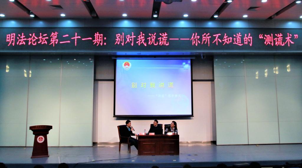 第21期明法论坛在逸夫楼刘皇发学术报告厅成功举办,本期主题为“别对我说谎——你所不知道的‘测谎术’”。 本期论坛的嘉宾有:北京市人民检察院第一分院检查技术部副主任梁骁、北京市人民检察院第一分院检查技术部心理测试专家张坤、北京市人民检察院第一分院公诉部副主任赵鹏。