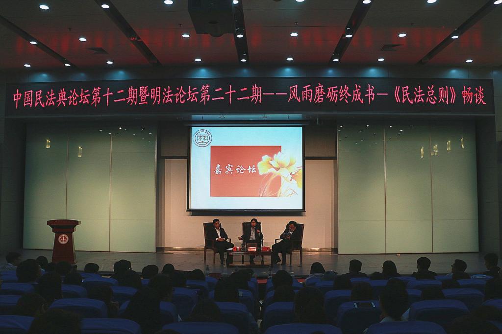 2017年4月10日晚,中国民法典论坛第十二期在我校刘皇发学术报告厅成功举办,我校尹志强教授、于飞教授和浙江大学朱庆育教授作为论坛嘉宾畅谈《民法总则》,全校同学们积极参与了本次活动。