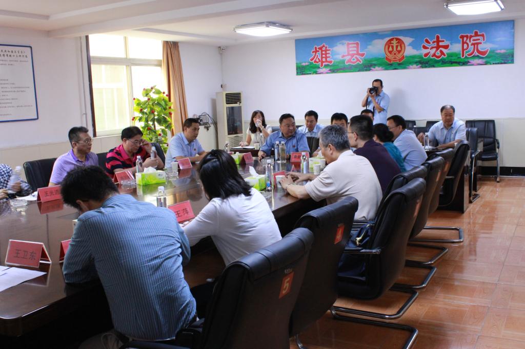 活动中,雄县法院院长王卫东向商法所参加活动的教师介绍了雄县的历史、人文概况和经济发展情况,我们考察了雄县法院基本概况及新区司法改革等情况,与雄县法院班子成员及相关庭室负责人进行了座谈。全体人员就新区房地产市场秩序和管理,法院改革方案,司法中心建设,法院专家智库建设,人才储备情况,新区未来上市公司的依法保护,新区原与相关企业已签合同的履行和解除,原有农村建设、修路合同手续的效用与解除,司法执行中涉及不动产问题、土地以租代买、发生流转如何补偿,机动车侵权按农民还是居民标准赔偿,国家用地涉及土地征收的补偿标准等问题进行了深入、充分的交流和探讨。