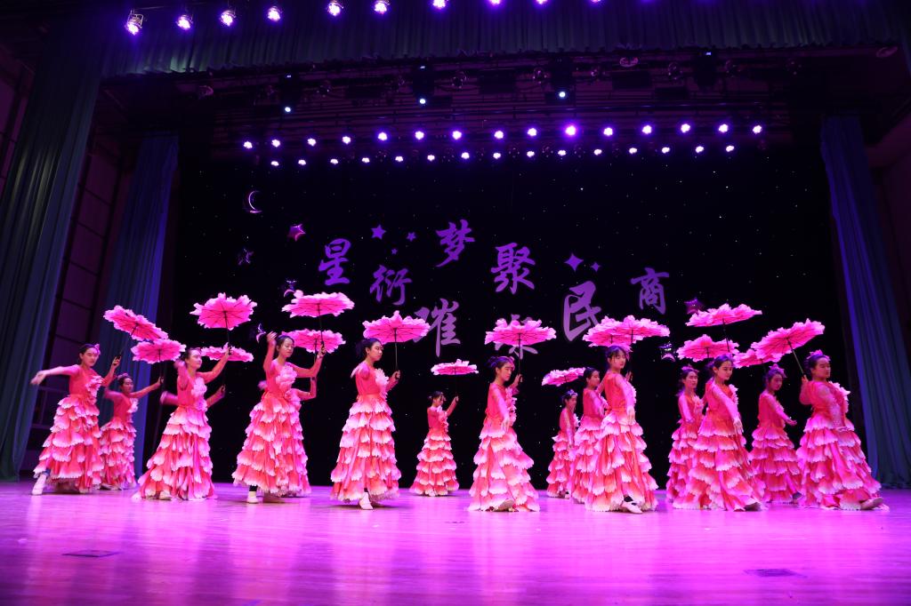晚上六点三十分,迎新晚会在学生会文艺部开场舞中准时开始。动感的音乐和熟练的舞姿让观众席欢呼不断,台上出色的表现展现了过去一个月文艺部每位成员的努力和拼搏,令人感动。