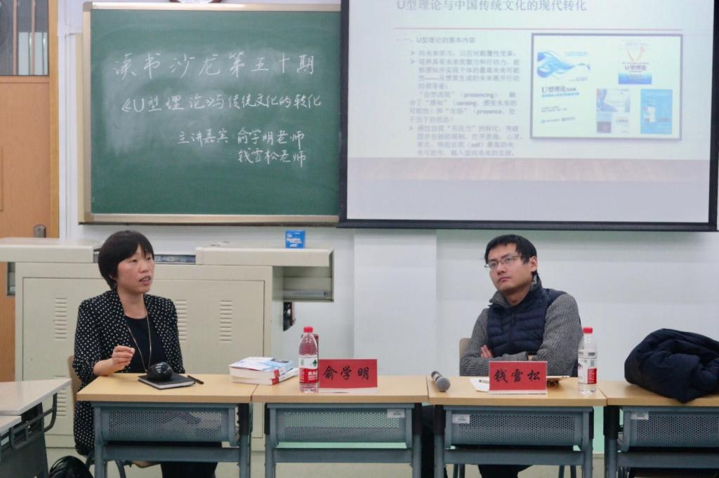 俞学明、钱雪松教授担任嘉宾。两位老师与同学进行了有关《U型理论》与传统文化的转化的分享,带领同学们思考在传统文化的现代转化中如何借用“U型理论”,为传统注入新鲜的血液。以下是本期读书沙龙的回顾。
