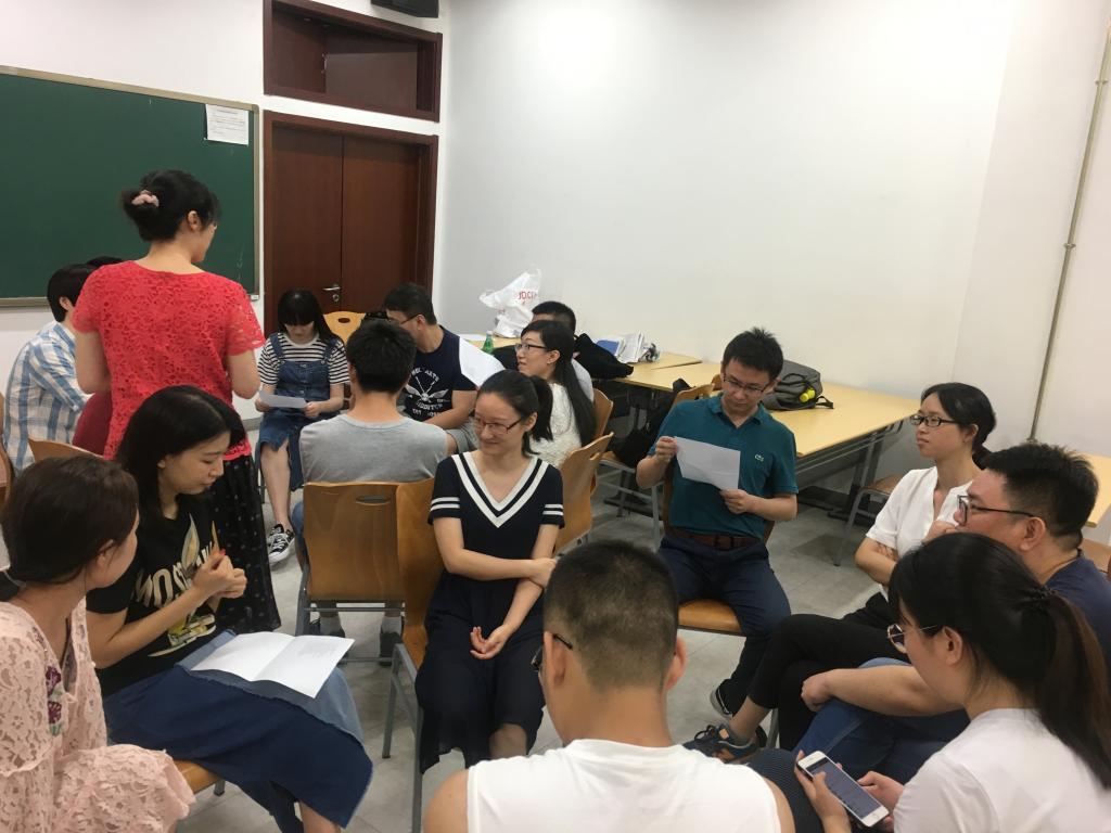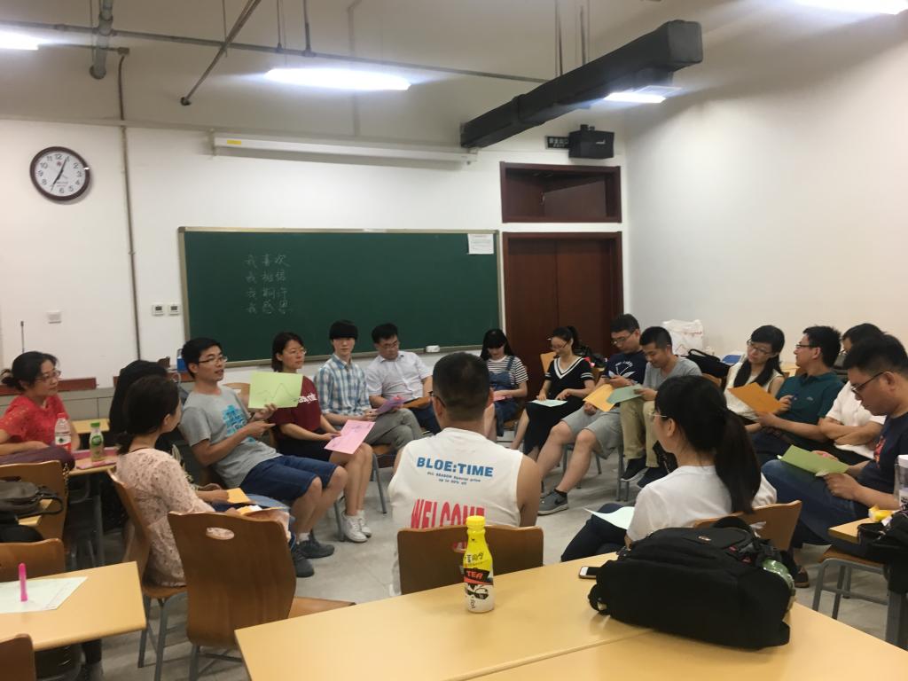 随着活动的开展,同学们的参与兴趣越发浓厚。王老师接着引导同学分组进行“增进相互了解”的接龙式访谈活动。发问者从王老师事先准备的问题列表中选取三个问题,回答者如实作答后再作为发问者向下一位同学提问,接龙完成全组同学间的问答。问题包括:“说出你最擅长做的一件事”、“你曾有过的巅峰体验是什么”、“你最希望做到的事是什么”和“你最需要鼓起勇气做的事是什么”等。同学们回答的内容非常相似,都表现出了对论文写作与发表的担忧。这一环节有效发现了博士生压力的重要原因,王老师提示大家要学会调节心情,应对困难。