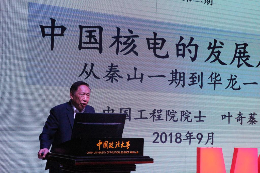 中国工程院院士叶奇蓁,中国“华龙一号”原总设计师咸春宇,中国“华龙一号”示范工程总指挥郭宗林。一个是中国老一辈核电专家、秦山核电站二期的主要技术负责人之一、总设计师;另外两位是中国第三代核电技术一线的工程技术专家和企业家,三位核电技术专家的联袂演讲,吸引了中国政法大学校园里的数百莘莘学子和社会听众。
