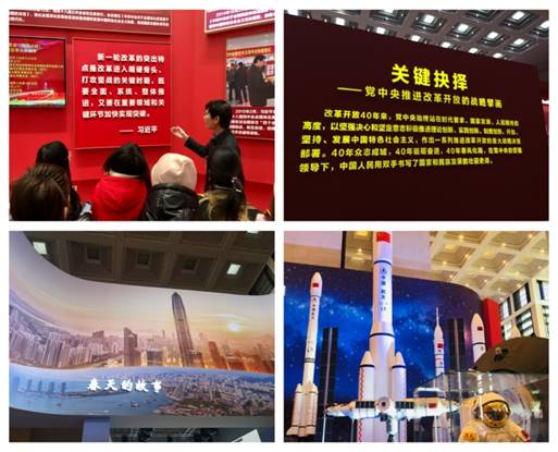 本次展览以习近平新时代中国特色社会主义思想为指导,以改革开放40年光辉历程为主线,紧扣“坚持和发展中国特色社会主义”主题,运用历史图片、文字视频、实物场景、沙盘模型、互动体验等多种手段和元素,向大众展示了了关键抉择、壮美篇章、历史巨变、大国气象、面向未来六大主题展区。参观过程中,老师和同学们在直观感受改革开放40年来国家的深刻变革和重大成就的同时,也纷纷用镜头记录美好瞬间,通过合影、留言等各种形式,留存时代印记,并热切交流了感想。