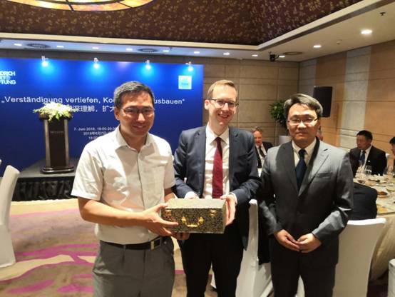 2018年6月7日,我所杨飞和娄宇老师参加德国弗里德里希•艾伯特基金会和中国国际交流协会举办的艾伯特基金会驻华首席代表交接庆典暨晚宴,为欢迎弗里德里希•艾伯特基金会会长Kurt Beck先生访华,为现任艾伯特基金会驻华首席代表仁恺先生辞行并与Alexander Kallweit(中文名康怀德)先生进行职务交接,杨飞和娄宇老师代表我所和赵红梅所长为仁恺先生赠送纪念品。