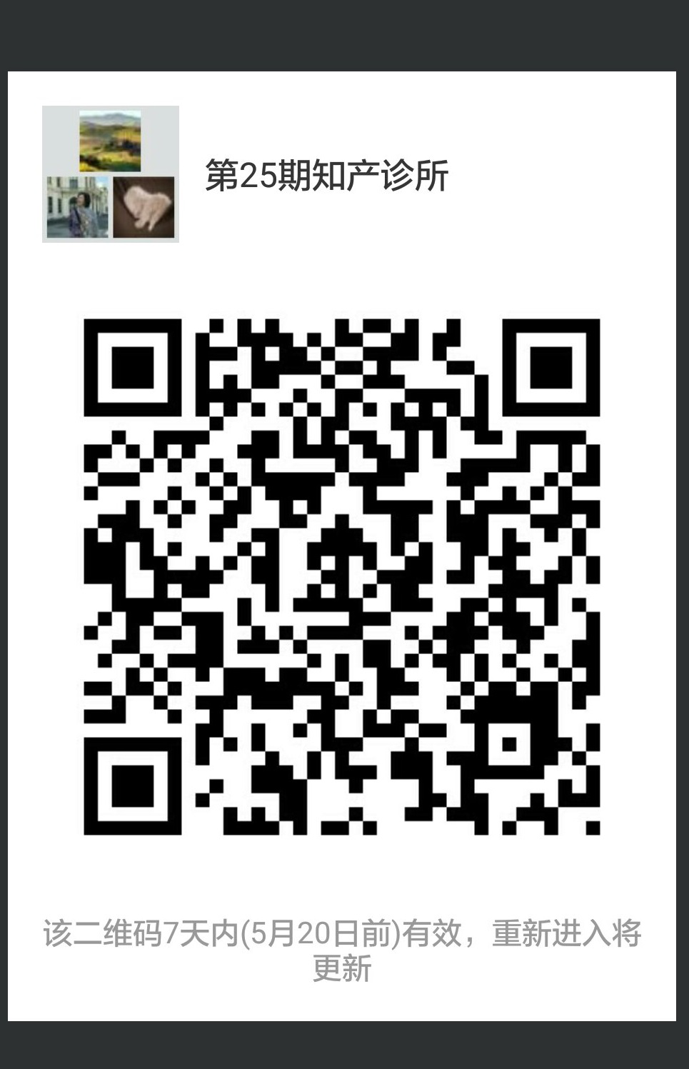 4、 请被录取的24名同学抓紧扫描以下二维码,加入微信“第25期知产诊所”群聊,并修改昵称为真实姓名。